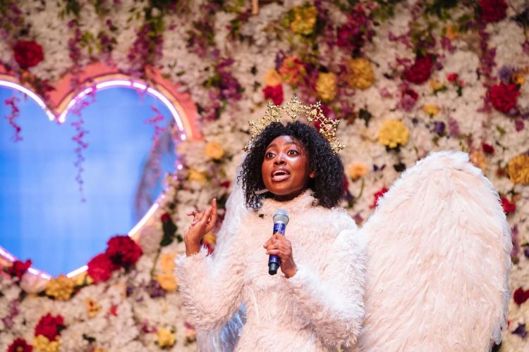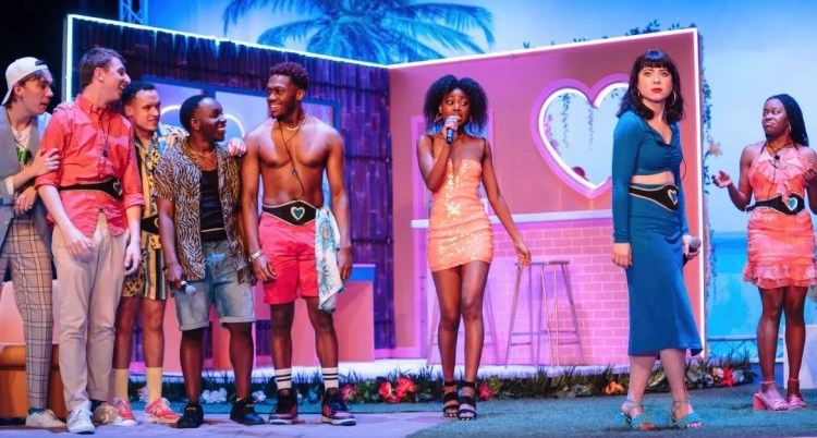 The Costume Department Left Alot To Be Desired Sadly As A Number of The Outfits Appeared To Be Rather Shambolic, Mis-matched, And Not Particualarly Well Presented or Coordinated. This With The Exception of A Few Characters Including The Smart Looking Jessica Enemokwul’s Leonato As A TV Executive, Olivia Ng As George Seacole And Their Fellow TV Colleague Tomas Azocar-Nevin As The Story Producer Conrad. Tilly Magwaza Looked Bright & Breezy In A Strappy Little Peach Number Which Seemed To Suit Her Personality And Indeed Let Claudio Know He’d Be Lucky To Have Her. But The Clunky 1980s Purse-Belt Style Love Heart Belts Didn’t Do Anyone Any Favours In The Fashion Stakes.
