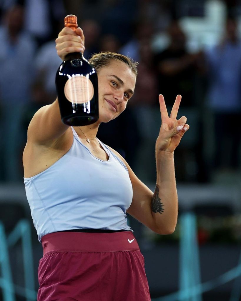 Belarusian Player @Aryna_Sabalenka Posed With A Bottle of Champers After She Beat World No.1 Polish @Iga Swiatek 6-3/3-6/6-3 At The Madrid Open May 2023 mutuamadridopen.com